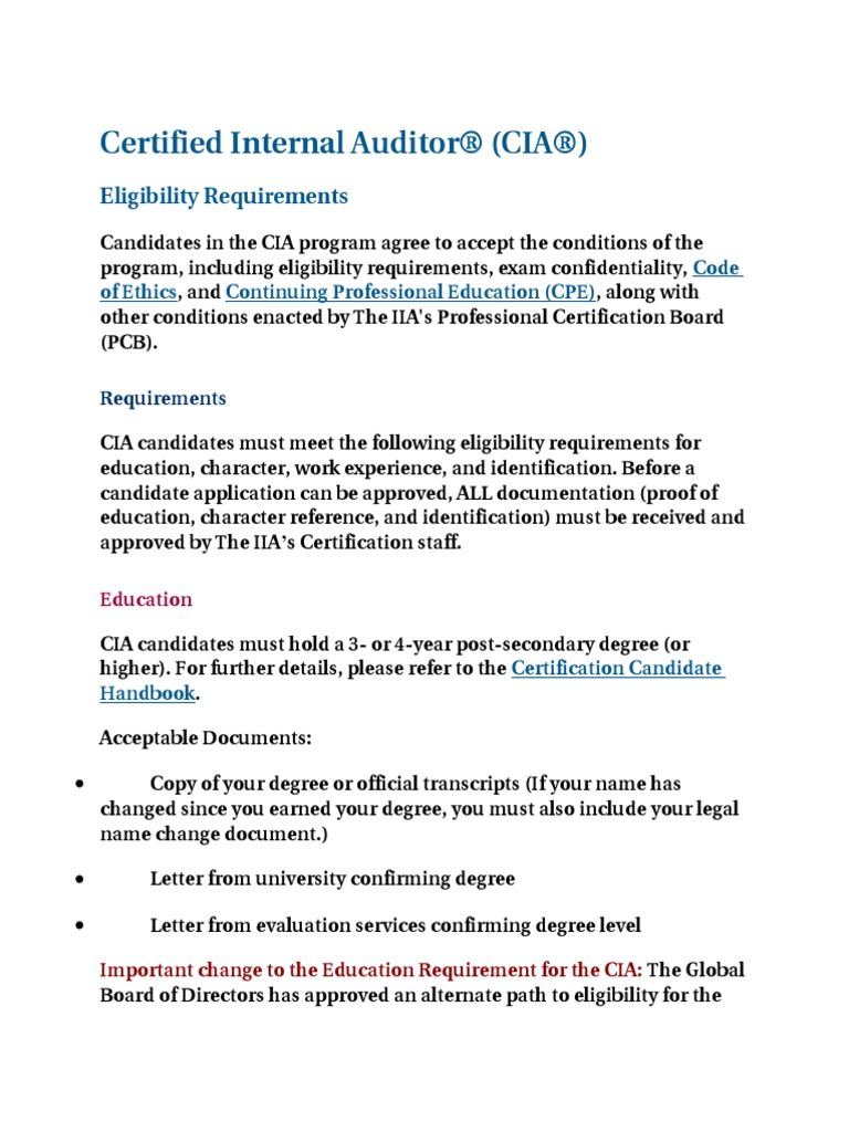 The benefits of earning the cia certification include increased job opportunities, earning potential, and respect, but before you receive these advantages, you must meet the requirements established by.